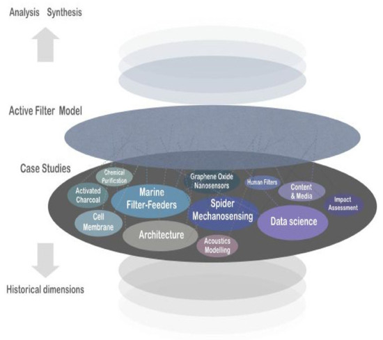 To fulfil this, our approach is to, while having a historical dimension in perspective, explore a variety of examples from contemporary developments within a wide range of research projects in the natural and social sciences that investigate filter materials, filter systems, and processes (Figure 1). A comprehensive Active Model of Filter is then built on the thorough study of the examples, to elucidate various aspects of the phenomena in the fields dealing with the term, and encourage further analysis and synthesis. Such an Active Filter Model would, on one hand, serve to address and assist a broad community of academics and industries in better understanding filter models within their activities, and developing more responsible practices thereupon, and on the other hand, can open new perspectives on locating and addressing the filter theme within a diverse realm of knowledge such as Active Matter, thermodynamics, abiogenesis, biology, ecology, information philosophy, media theory amongst others.
