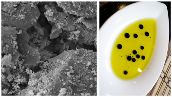 Chemical Purification; examples of adsorption and phase separation: (Left) Active charcoal. Scanning electron microscopy micrograph of activated charcoal showing the large available surface area resulting in high adsorbability. (Right) Phase separation of oil and vinegar. Hydrophobic oil and hydrophilic vinegar separate into two different phases, which can be used to filter one out of the other (images adapted from Wikipedia common. (Left) Wikimedia Commons contributors, “File:Activated Charcoal.jpg,” Wikimedia Commons, the free media repository, https://commons.wikimedia.org/w/index.php?title=File:Activated_Charcoal.jpg&oldid=417429816; (Right) Wikimedia Commons contributors, “File:Olive oil with Balsamic Vinegar.jpg,” Wikimedia Commons, the free media repository, https://commons.wikimedia.org/w/index.php?title=File:Olive_oil_with_Balsamic_Vinegar.jpg&oldid=331512136 (accessed 17 June 2020).