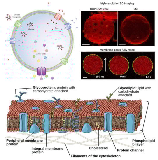 Cell membrane. Top-left: The plasma membrane selective transport; transporter proteins use energy to selectively transport substances in and out of the cell, regulating the concentration of different molecules and ions (adapted from [32] © Nature Education). Top-right: High-resolution 3D images of two exemplary Giant Unilamellar Vesicles (GUV); synthesized simple cell-sized model membrane systems, that are typical for studying and modelling of various features and characteristics of the more complex biological membranes. Confocal snapshot of the GUV shows an example of the before and after membrane poration induced by an applied DC pulse (image adapted from [37] under a Creative Commons Attribution 4.0 International License). Bottom: The fluid mosaic model of the cell membrane: The fluid plasma membrane consisting of the bilayer phospholipids, cholesterol, and proteins (image adapted from [38] licensed by CC BY-NC-SA 3.0 US).