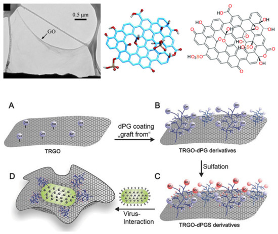 Graphene oxide nanosheets as pathogen inhibitors. Top row: Transmission electron micrograph of a single graphene oxide (GO) 2D sheet on the left; and structural model and formula of an exemplary GO on the right (The top-left image adapted with permission from [50], and the top-right image partially adapted with permission from [48]). Bottom: The schematic of a thermally reduced graphene oxide sheet (TRGO) is shown in the image sequence A. The TRGO can be coated with the dendritic polyglycerol polymer chain branches (dPG) shown in B. The added brancheds can be further sulphated and functionalized, as shown in image sequence C, with red sulphated functional groups sitting on top of the dPG branches. The electrostatic interactions of these functional groups with the outer membrane of a virus can lead to conformational change of the nanosheet and entrapment of the pathogen as depicted in D (the bottom image sequence A-D is partially adapted with permission from [54]).