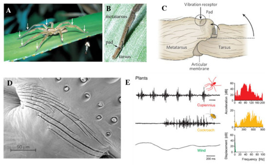 Mechanosensing in spiders. (A) and (B). show the spider Cupiennius salei sitting on a leaf with the location of the vibration sensors shown with arrows ((A) partially adapted with permission from [56]; (B) partially adapted with permission from [58] under the terms of the Creative Commons Attribution License 4.0 International (CC BY 4.0)). (C). depicts the relation of the vibrational sensor on the metatarsus, the cuticular pad, and the articular membrane, and how the system is stimulated when the upward movement of the tarsus compresses the pad (partially adapted with permission from [56]). (D). shows a scanning electron micrograph of the metatarsal organ and the vibration detector slits (The SEM micrograph (D) adapted with permission from [56]). The vibrational environment of the spider in its natural habitat is shown in (E), with the frequency spectra on the right side and the oscillograms related to specific vibration on the pseudo-stem of a banana plant on the left (image adapted with permission from [59]).