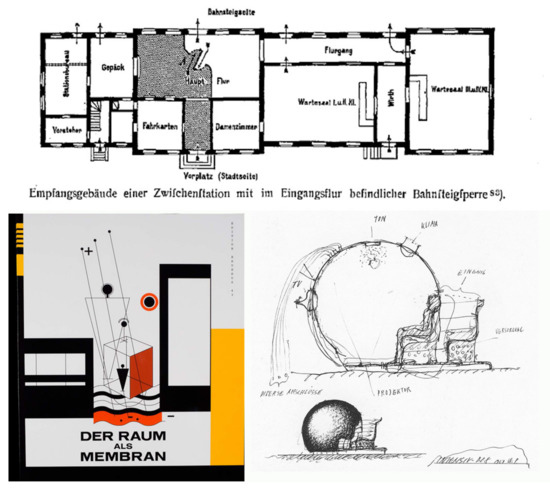 In 1926, the Bauhaus-student Siegfried Ebeling wrote an essay in which he introduced a new concept of architecture that he called Space as Membrane [68], and opposed it to what he considered the obsolete idea of space as a mere shell. In his small book, he elaborated on what future buildings should be capable of in terms of certain functions and performances. With what he called “biological architecture” [68] p. 19, he redefined the wall—traditionally being seen as a load-bearing, massive, and impenetrable element—as a three-dimensional semipermeable membrane or skin. Its porosity was not achieved by a mere adding of windows and thereby physically penetrating them, but by transforming walls into filtering devices. The cover of the book (Figure 7 bottom-left), shows in an abstract fashion how he conceived the building as a transient medium between the individual and his or her environment, permeable for different forms of electromagnetic spectrum that by penetrating the building would affect its interior in terms of natural and artificial light conditions, air, temperature, ventilation, and air pressure. The specific design of the wall openings would produce a “filtered stream of light” that is being “automatically regulated” [68] p. 36. Ebeling noted that his active, adaptive, and automatic architecture would not be a result of putting up a set of apparatuses like radiators, lamps, or blow fans, but to turn the building itself into some sort of biological system that reacts to surrounding conditions. His membrane building was meant to adapt to the climatic conditions of its specific location, and the house could become its own energy source, converting exterior radiation into usable energy, intensifying and optimizing the individual’s physical and psychological experience of the space he or she is living in. As an architect, he was not so much interested in the membrane as a material but what he considered its biological functioning. Transferring its performance to architecture turns buildings into “responsive, active systems” [69] introducing forms of agency and self-regulation into architecture.