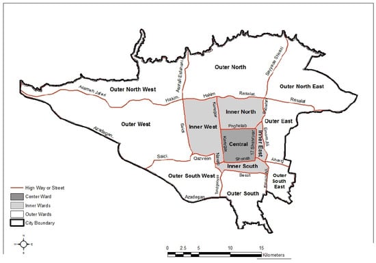 This research employed the new geographic division of Tehran, in which the whole city is divided into the main urban districts (center, inner, and outer wards) and the main geographical directions. It must be noted that Tehran consists of 22 administrative municipal regions (AMRs), but the boundaries of these AMRs are not compatible with the aforementioned divisions.