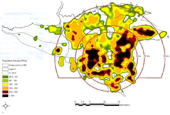 The functions of density as a key physical measure in urban planning can be modified in different spatial structures. A definite average value of density at the city or neighborhood scale can be interpreted as high or low, but the same value of density can be applied in a variety of urban spatial structures [37]. In other words, the spatial pattern of high- or low-density spots of population and employment in the city or city–region structures can provide more precise measurements to assess the impacts of density in urban development than a gross average value of density at the neighborhood or city scale [38].