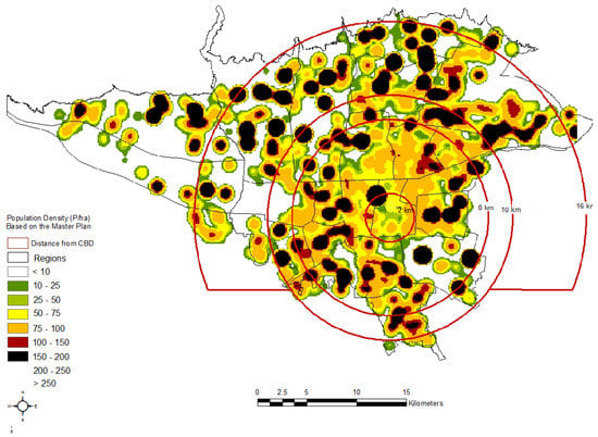The average density of Tehran as the case study was 128 P/ha in 2011, which is categorized as a high-density value. However, this city never enjoyed any of the claimed positive effects of high density. Heavy traffic, high VMT, and air pollution turned into a crisis for Tehran’s inhabitants [79,80,81]. As Neuman (2005) and Handy (1992) argue, average density tends to reduce the complex entity of urban form differentiations into one crude criterion. Several other authors are critical of this approach, as well [45,80,81,82].
