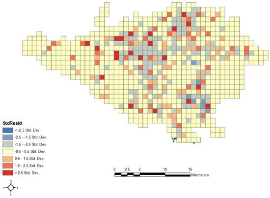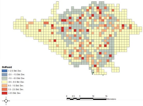 For the modeling of the spatial pattern of possible populating of sub-zone (PPS) and possible growth of commercial activities in sub-zone (PCS), the Getis–Ord Local G Statistic [65] was used. Compared to the global Moran’s I and local Moran statistics model, this model has the advantage of distinguishing the hot density clusters (high density) and the cold density clusters (low density), while Moran’s I statistics model analyzes similar clusters in terms of their quantitative or qualitative values [66]. In this research, the resolution of the raster maps was 100 m × 100 m.