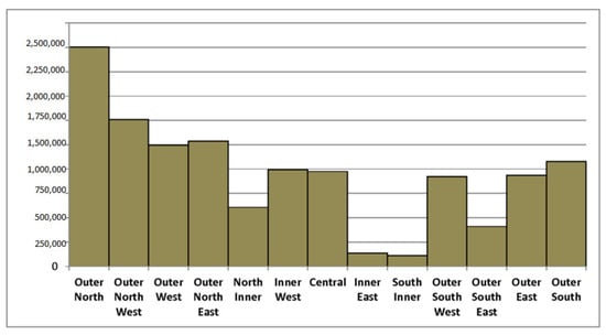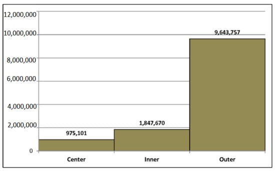 The central area of Tehran comprised three percent of the city’s population (0.209 million) in 2011, while 83% (6.7 million) lived in the outer areas (Figure 2). Of the total population living in the outer areas, the north and south wards housed over 58% (3.97 million) and 20% (1.39 million), respectively [20].