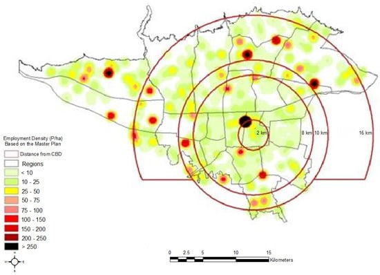 Many of the earlier studies on density take a general approach by only using aggregate data [33,34,50,51]. Referring to the average density as a gross and universal indicator, they smooth out the spatial pattern of population and employment clusters in the city. Indeed, average density cannot reflect the variations of density and, thus, fails to reflect the urban structure accurately [37,52]. In this way, the validity and interpretability of density indicators often suffer from a lack of—or an unclear—definition of a spatial relationship [53].