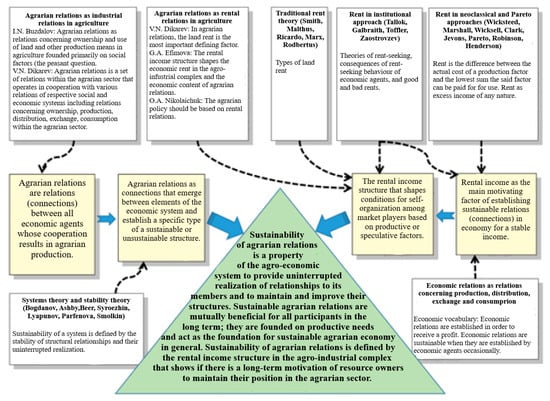 Among economic relations in various sectors, agricultural ones, of course, have every right to be considered the most important, determining the satisfaction of basic priority human needs. However, there is no unified approach to their understanding. Thus, many economists have their own definition of agrarian relations: some describe them as industrial relations in agriculture [10,11,12]; some define them as economic relations emerging in agrarian production due to land ownership and its utilization (or the so-called economic and legal aspect of land relations [13]); others propose a rental approach, which is based on contemporary beliefs that agrarian relations are founded on rental relations in the agro-industrial complex [14,15].