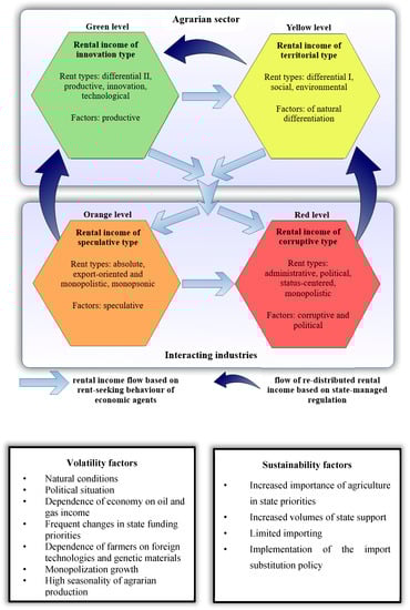 At the green and yellow levels, the rent mechanism operates on the basis of differentiation of intra-industrial conditions of the agrarian sector; at the red and orange levels, it operates on the basis of differentiation of inter-industrial conditions. Currently, the effect of green-level productive rental stimuli in Russia is limited due to high volatility of rental proportions (Figure 3 also demonstrates the current volatility and sustainability factors), in which frequent changes do not encourage investments into the agrarian sector.