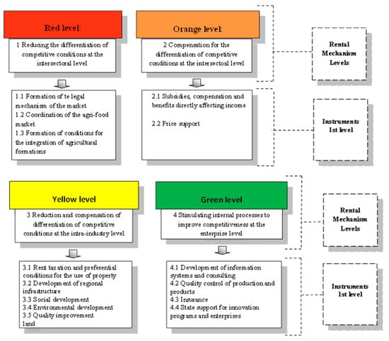 Regulatory measures of the yellow level consider the necessity to decline differentiation in business conditions caused by objective differences in quality of resources. The main objective at this level is to create potentially equal business conditions for all sub-industries and various businesses within the agrarian sector and encourage rational and intensive agriculture activities. This can be achieved through the distribution of rental income from businesses in a more favorable position to less fortunate ones with the help of taxation, adjustment of subsidies, and compensations to specific agrarian businesses. Regulatory measures of the orange and red levels are aimed at establishing supportive external conditions for the agrarian sector. The orange level applies primarily economic regulatory measures to compensate for objectively financially disadvantageous features of agrarian production as compared to more monopolistic industries or industries with products of a higher margin. Thus, the second stage must finish with the determination of areas of high priority for regulation within the agrarian sector and description of regulatory measures that would encourage the self-organization of agrarian relations and lead to stronger synergy.