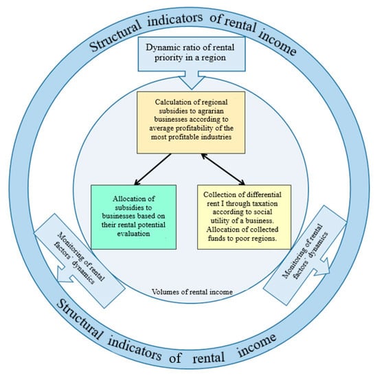 Here, a total volume of financial support allocated to a region can be adjusted according to a rental priority dynamic ratio of the said region using a model based on the rental profile (assessment of the rental income structure). Further allocation of subsidies to businesses can be made based on an assessment of their rental potential with the use of regression analysis (absolute assessment of rental income). Regional differentiation can be declined through taxation of agricultural land according to calculated differential rent I and the development of poor regions [52,53].