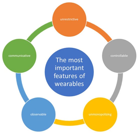 Studies [] also pointed out that the most important features of wearables reside in them being: unrestrictive (they have incorporated hands-free technology, which enables users to performing several activities at the same time); controllable (the user has the ability to control it always); attentive (technologies having various sensors and functioning modes); observable (giving the opportunity to use alerts, reminders, or messages in order to attract user’s interest); communicative (offering the possibility of exchanging information through various options such as Bluetooth and wireless networks) and unmonopolizing (there are several actions that the user can do at the same time, minimal attention being necessary for these activities). These advantages are presented in Figure 1, below: