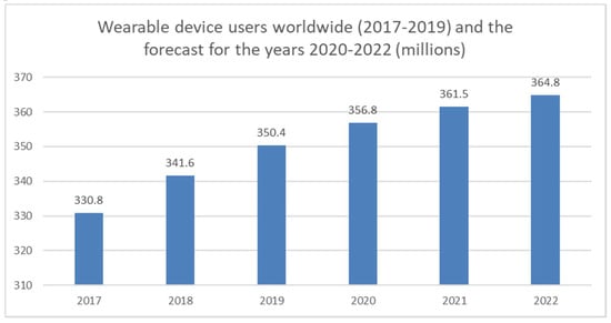 Global wearable device users (2017–2019) and forecast (2020–2022) (millions) [].