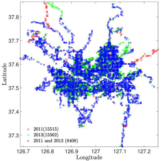 Locations of bus stops in the Metropolitan Seoul bus system: Blue dots represent bus stops persisting between the two years 2011 and 2013. Bus stops present only in 2011 and in 2013 are represented by red and green dots, respectively. Numbers in parentheses refer to the number of corresponding stops.