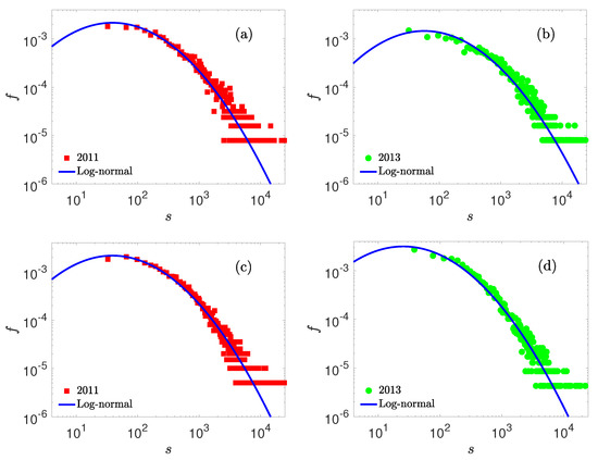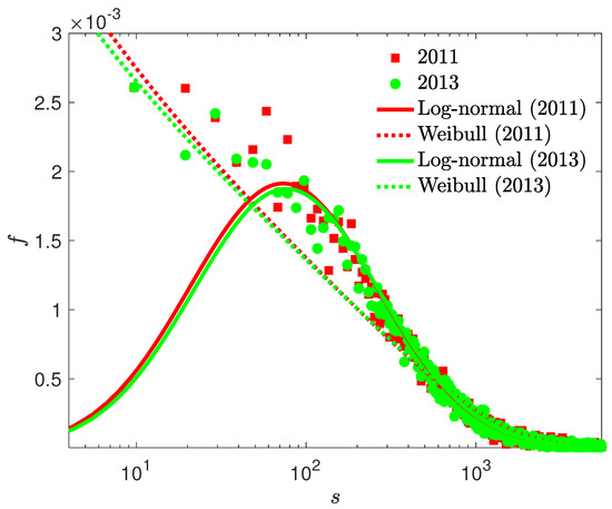 Distribution f of strengths s in the Seoul BTN, plotted on the semilogarithmic scale. Red squares and green circles are data points for the years 2011 and 2013, respectively. Solid and dotted lines plot the log-normal and the Weibull distributions, respectively, obtained via the maximum likelihood estimation from the data for . The location and the scale parameters of the log-normal distributions are given by for 2011 and for 2013. The shape and the scale parameters of the Weibull distributions are estimated as for 2011 and for 2013.