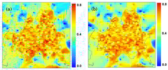 Heat map of Seoul depicting the spatial distribution of the Gini coefficient levels, specified by color, of all bus stops in the years (a) 2011 and (b) 2013. (For the color code, see the vertical bar on the right.) Accordingly, intense red regions correspond to those housing hub stops while the black line corresponds to the municipal boundary of Seoul.