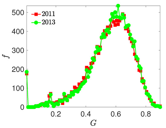 where denotes the number of bus stops with non-zero passenger flows to and from the ith bus stop, i.e., bus stops with . The Gini coefficients computed for all bus stops in the Seoul BTN lead to the spatial distribution in Figure 3, where the Gini coefficient levels are color-coded. Overall, the spatial distributions in the years 2011 and 2013 turn out to be qualitatively the same, confirming that the Seoul BTN remained stable between these two years.