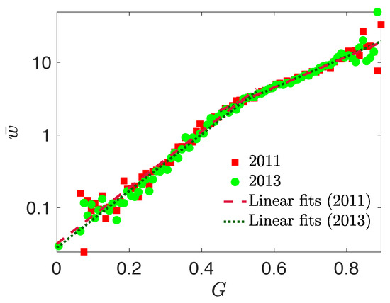 Mean weight vs. the Gini coefficient G for each node. The two lines at each year, least-square fits of the data points below and above , meet at that point.