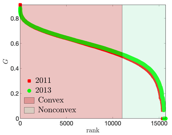 The remaining task is how to choose the boundary between hubs and peripheries. Here we notice that Figure 5 exhibits characteristic changes of the behavior at the Gini coefficient : Specifically, the mean weight growth with G changes its slope at . For more information, we also consider the rank distribution of the Gini coefficient and present the result in Figure 6, where each data point represents the Gini coefficient at each rank. To probe the change in the decreasing behavior of the Gini coefficient with the rank, we perform the convexity test [39], which reveals that the convexity changes (from convex to non-convex behavior) around the rank 11,000. It is pleasing that this rank corresponds to as well. This apparently suggests as the boundary between hubs and peripheries. As a result, we choose specifically the rank 11,108 as the criterion separating hubs and peripheries since the bus stop ID on this rank commonly exists in both 2011 and 2013 data sets.
