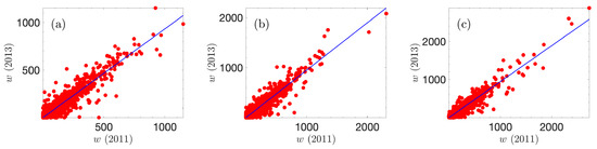 We now consider weights between any two among the stops, classified into the three types of pair: periphery-periphery, hub-periphery, and hub-hub pairs. Then several regression methods, including the least square regression (LSR), least absolute deviation (LAD) [40], and orthogonal regression (OR) [41,42,43], are applied, leading to the correlations of the three types of weight between the two years. Figure 7 exhibits the obtained weight correlations between the years 2011 and 2013. The slopes of the correlations obtained via the three regression methods are presented in Table 1.