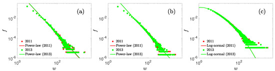Distributions of (a) periphery-periphery, (b) hub-periphery, and (c) hub-hub weights. In (a,b), the red lines represent power-law distributions with exponent and , respectively, for the year 2011; green lines plot power-law distributions for 2013, with exponent and , respectively. In (c) the red and green lines depict the log-normal distributions with for 2011 and for 2013, respectively. In all cases, the two lines overlap with each other too closely to distinguish.