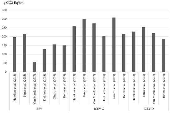 Figure 1 displays the results for the GWP from several studies. Most studies compared BEVs and gasoline-powered ICEVs [3,4,5,19,25,26], only four of them included diesel-powered ICEVs [5,19,25,26]. Van Mierlo et al. presents the smallest greenhouse gas (GHG) emissions for the BEV [26]. Their results for the gasoline-powered ICEV are the second highest and the third highest for the diesel-powered ICEV. They considered a small passenger car segment for their comparison: a Volkswagen Golf for the diesel- and gasoline-powered vehicles. They named some models which they recognized for the BEV, but remained unclear on which parameters they chose. Their supply chains and choice of vehicle technologies geographically relied on Belgium. They assumed a lifetime mileage of 209,596.5 km (14.1 years with 14,865 km per year).