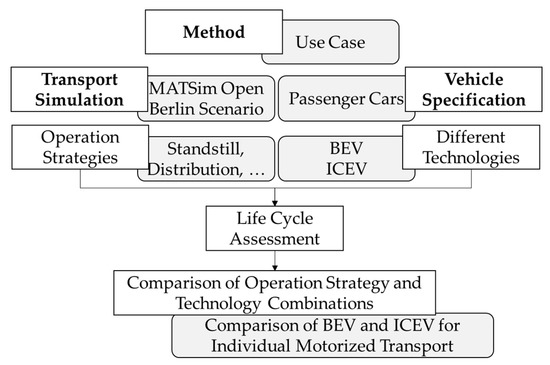 The goal of this study is to demonstrate the influences of different technologies and strategies for transport systems on several LCA impact categories. Therefore, we present a method which combines an LCA with an agent-based transport simulation and validate our method with the use case of Berlin’s MIT. Figure 2 depicts the basic approach of the method in white and the respective details of the use case in gray (Figure 2).