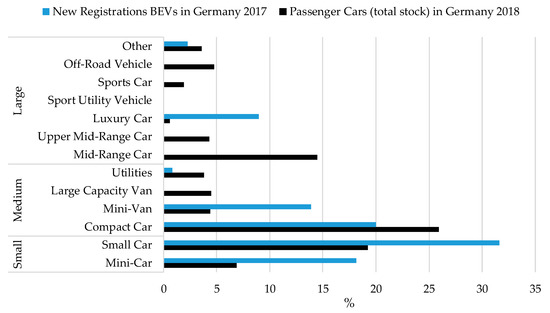 Figure 3 shows the vehicle distribution for conventional and electric cars in Germany in 2018 and the new battery electric vehicle (BEV) registrations for 2017 [39,40]. We used nationwide German data as Berlin-Brandenburg’s vehicle distribution is not available. In 2018, most vehicles were either compact cars (25.9%), small cars (19.2%) or mid-range cars (14.5%). In contrast, the new BEV registrations describe possible trends of a future vehicle distribution. They consist of 31.6% small cars and only 20.0% compact cars. The mini-car has a share of 18.1% and therefore accounts for double the share of vehicles compared to ICEVs.