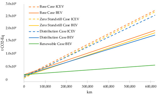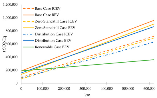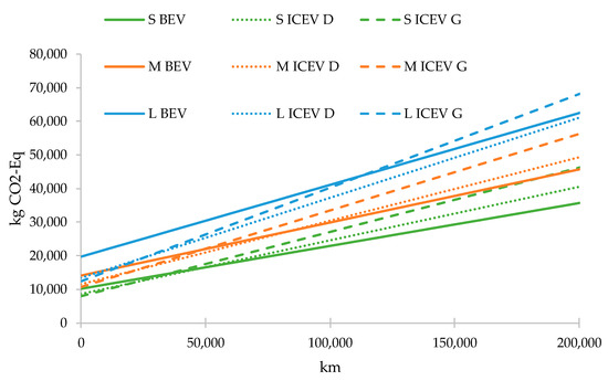 We modeled the direct emissions from the combustion (ICEV) based on the emissions from the corresponding processes (e.g., “transport, passenger car, medium size, diesel, EURO 5”) in Ecoinvent. The Ecoinvent data sets distinguish between consumption-dependent and -independent emissions. The independent emissions rest on the EURO 5 standard, but as the modeled vehicles in Ecoinvent are from 2010 and the consumption is based on a realistic drive cycle (EURO standards are based on driving cycles), the standards are exceeded [54]. Therefore, we parameterize the independent and dependent emissions according to the consumption of the ICEV and the emission factors for biofuels as defined by [55] (emission factors are −59 g CO2-Eq./kWh for biodiesel and −52 g CO2-Eq./kWh for bioethanol).