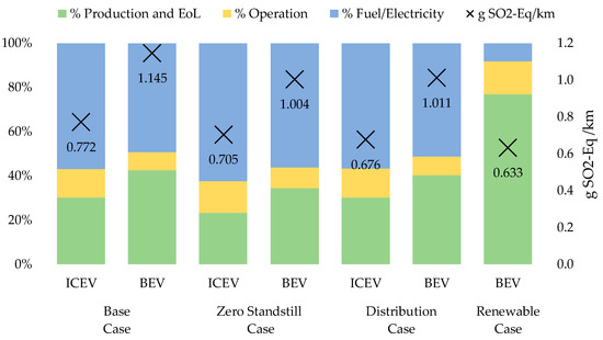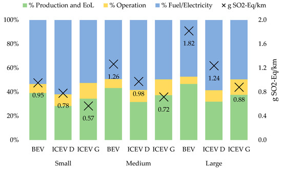 The gasoline-fueled vehicle shows the lowest AP for all vehicle classes, followed by the diesel-fueled car. The BEV has the highest impact regarding AP. Major contributors are the production, EoL (especially the battery production) and the electricity consumption (main contributors: electricity from hard coal, lignite and biomass) during driving (Figure 6). For the ICEV, the fuel consumption is the main source of sulfur dioxide equivalent emissions.