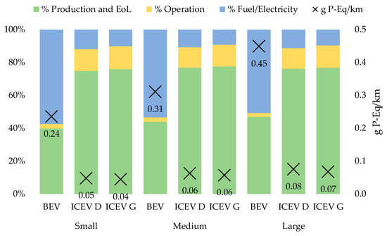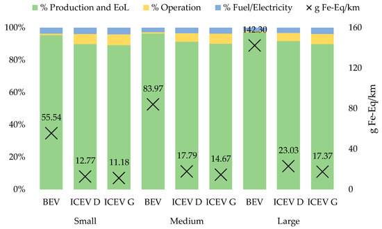 We assumed Germany’s grid mix from 2018 (see Section 2.2.1) and a lifetime mileage of 168,000 km. The results vary for the vehicle classes and types, and for the impact category (Figure 4, Figure 5, Figure 6, Figure 7, Figure 8, Figure 9 and Figure 10).