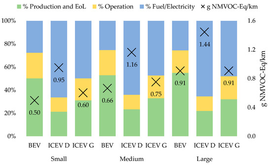 The electric vehicle has the lowest GWP for all vehicle classes except large, although it has the highest share in production and EoL compared to the diesel- and gasoline-fueled vehicles. Especially for the large electric vehicles, the battery causes marginally higher GWP, compared to the large diesel-fueled vehicle (Figure 4 and Figure 5).
