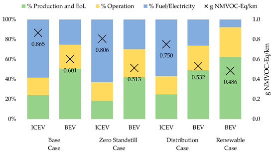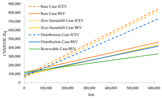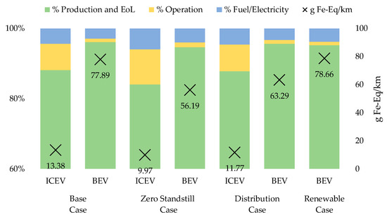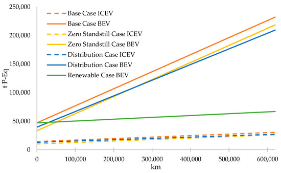 For MDP, the advantages of the ICEV cases are tremendous (Figure 21). Production has a share of over 80% for all cases. Subsequently, the BEV renewable case shows only slight differences. However, the zero standstill and distribution cases demonstrate higher gains in comparison to the base cases (BEVs and ICEVs). In addition, the consideration of MDP over lifetime mileage shows only slight gains. In contrast to all other investigated impact categories, covering the energy demand with renewable sources even increases the MDP (Figure 22).
