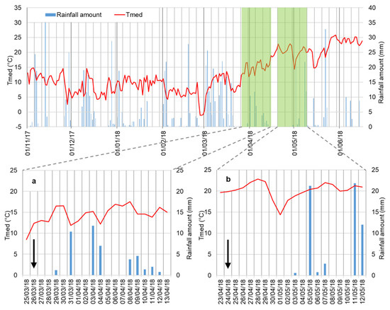 Average daily air temperature and rainfall at the study site during the study period (from November to June); (a,b) indicate the emission sampling periods during the crop cycle. The arrows indicate the day on which the fertilization was performed.