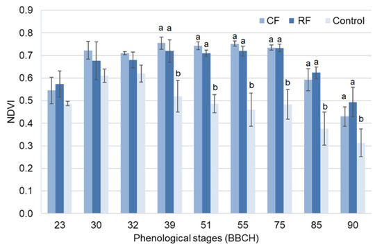 Even during the senescence stage, RF tanks showed higher NDVI than CF. Since NDVI is a way to measure plant health, in this experiment crops responded well to RF management: it thus appears that crops did not require additional N. On the contrary, significant differences were observed between the Control and the two fertilizer treatments starting from the flag leaf stage (BBCH 39). It was shown previously that NDVI is directly dependent on N fertilization [68]. The lower the N level supplied to crops, the lower the chlorophyll content and the lower the absorption of radiation in the visible region, which in turn results in a reduction of NDVI. Therefore, the lack of N in control tanks led to premature yellowing of crops and a stunted vegetative state.