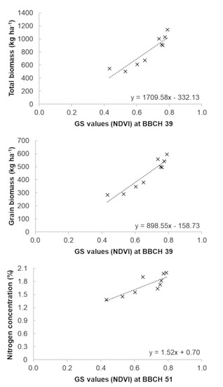 Regarding the relationship between N content and NDVI, the present results corroborated previous findings, as a study carried out on wheat that showed correlation between NDVI measured in different growth stages and grain properties, thereby revealing high relationships (R2 > 0.90 at heading stage) for both grain/biomass yield and N content [75].