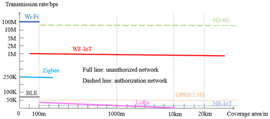 The wide area fusion Internet of Things (WF-IoT), invented in China, is a kind of RFID-based low-power WAN communication technology [15,16]. The WF-IoT gateway has a decentralized haze computing capacity, which can greatly compress the traffic, combined with the cloud computing of the cloud control platform. In addition, a WF-IoT node is a single-chip system that integrates commercial lighting networks, identification and positioning networks and wireless sensor networks, which has context sensing fog computing ability. Therefore, considering its advantages, such as its long distance, large capacity, medium and high speed, that it is free of charge and its low power consumption, WF-IoT is a mature product which is the best choice for tunnel lighting control systems. Figure 1 depicts the comparison of communication capabilities between WF-IoT and other IoT technologies.