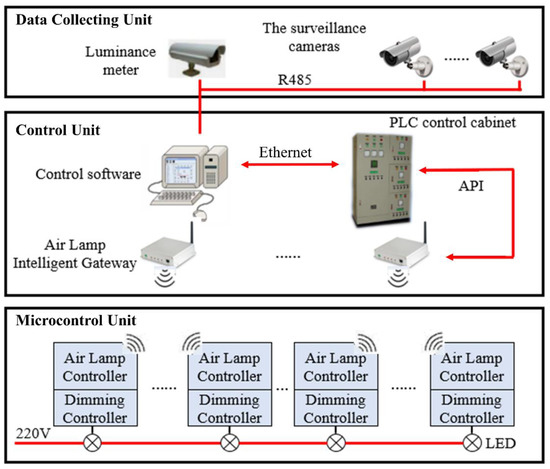 The structure of the control system is divided into three units: data collecting unit, control unit and microcontrol system unit, as shown in Figure 3. Firstly, the data collecting unit acquires data. The exterior luminance, the velocity of the vehicle and the traffic flow are collected by luminance meters and surveillance cameras. Then, the control unit, consisting of the programmable logic controller(PLC) control cabinet and control software, and which is used to receive the collected data from the data collecting unit, calculates the demand luminance and realizes group control of the luminaires. Finally, the microcontrol unit receives the message from Air Lamp intelligent gateways, and the luminance of the LED lamps with the embedded Air Lamp controller and dimming controller can be adjusted through the WF-IoT.