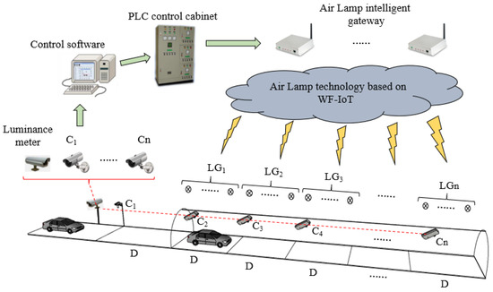 To achieve the effect of illumination moving with the vehicle, the length of each illumination segment is selected as 400 m (call this length D, the specific calculation method is in the next section), and LED lamps within an illumination segment form an LED group, i.e., all the LED lamps in the tunnel are divided into several LED groups which are controlled by Air Lamp intelligent gateways. In addition, the luminance meter is installed in the exterior of the tunnel, and the surveillance cameras are installed in front of each LED group to detect the vehicle. It is worth mentioning that the first surveillance camera C1 is installed at about a distance of D away from the tunnel entrance to ensure that LG1 is adjusted to the luminance demand before the vehicle enters the tunnel. When the vehicle is detected by Ci, the luminance demand is calculated by the control software based on the exterior luminance, the velocity of the vehicle and the traffic flow. The control software sends the information of calculated luminance to the PLC control cabinet. Finally, the control command is sent to Air Lamp controllers by corresponding Air Lamp intelligent gateways through the WF-IoT, then LED lamps can be adjusted to the calculated luminance group by group.