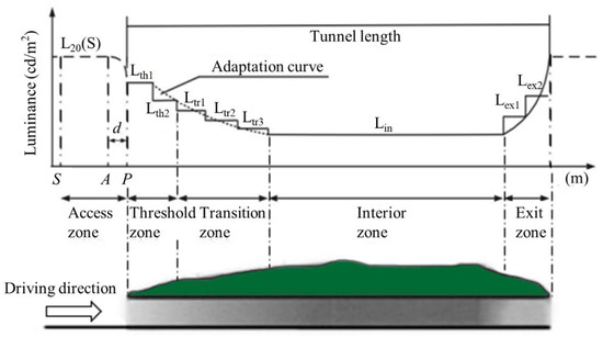 To compensate for the “black hole effect” and the “white hole effect” due to the tunnel structure properties, and ensure the safety and comfort of the driver [17,18], luminance inside the tunnel should be calculated to satisfy the luminance demand in the intelligent control system proposed in this paper. Figure 5 depicts the adaptation curve of the luminance in the tunnel according to the relevant provision of CIE Publ.88 [19] and JTG [20]. Many provisions of JTG reference CIE Publ. 88 and take into account the actual situation of tunnels in China. However, there are some slight differences between JTG and CIE Publ.88. According to JTG, the transition zone is divided into three sections, which is the same as CIE Publ.88, and the threshold zone and exit zone are divided into two sections, which is different from CIE Publ.88. Fan and Li [21] used MATLAB according to the data in JTJ [22] to fit the linear regression function of each zone, and the detailed calculation methods according to JTG (2014) are shown in Table 1. In Table 1, L20 is the real-time exterior environmental luminance which is related to the external luminance, the climatic conditions and the traffic velocity. According to CIE Publ.88, L20 can be calculated by the function in Table 1. In addition, L20 can also be obtained through JTG based on engineering experiences.