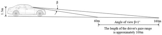 The driver’s field of vision should be taken into account due to the fact that the distribution of road surface luminance within this range directly affects the driver’s vision. As is shown in Figure 7, the average viewing height of the driver’s observation of the road surface is about 1.5 m, and the length of the driver’s visual range is about 100 m [19]. Thus, the driver’s maximum viewing distance is about 160 m, according to CIE Publ.88. In addition, the stopping distance is also an important parameter to ensure the safety of the driver, which depends on the speed of the vehicle, the longitudinal gradient and the road surface condition. The stopping distance, which should be evaluated for tunnel lighting, is the sum of two stretches of road: one is the distance covered during the driver’s reaction time; the other is the distance covered during the braking time. The stopping distance according to the specifications is shown in Table 2 [19].