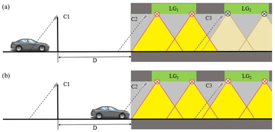 The group control method for the tunnel entrance. (a) When the vehicle is detected by C1, (b) when the vehicle is detected by C2.