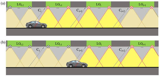 The group control method for the tunnel interior. (a) When the vehicle is detected by Ci, (b) when the vehicle is detected by Ci+1.