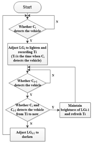 The flow chart of the intelligent control system is shown in Figure 10. The LED group LGi−1 is adjusted to darken only when there are no vehicles that are detected by the surveillance cameras Ci and Ci−1. To be more specific, if Ci detects a vehicle, LGi adjusts to the calculated luminance, and the system records Ti (the time when Ci detects the vehicle). When Ci+1 detects the vehicle, the system judges whether Ci and Ci−1 detect the following vehicle, and if the answer is yes, LGi−1 maintains the calculated luminance and refreshes Ti, otherwise, the system adjusts LGi−1 to the minimum luminance. In other words, the intelligent control system can estimate whether there are following vehicles within the range of two LED groups, and if a following vehicle is detected by one of the surveillance cameras, Ci or Ci−1, the LED group LGi−1 keeps a high luminance to fulfill the luminance demand for the following vehicle.