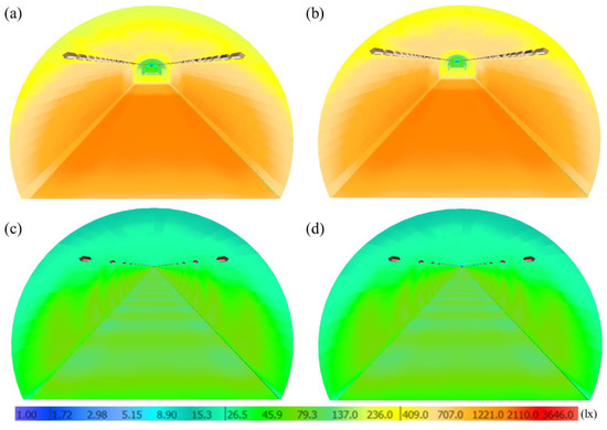 The pseudo color diagrams of illumination in the tunnel (a) when the vehicle is detected by C2 and under the general control system; (b) when the vehicle is detected by C2 and under the intelligent control system; (c) when the vehicle is detected by C3 and under the general control system; (d) when the vehicle is detected by C3 and under the intelligent control system.