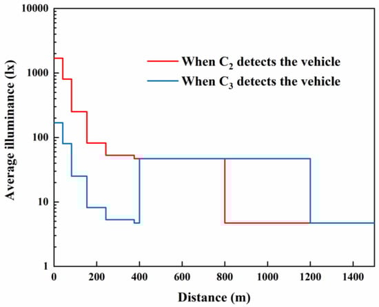 The average illuminance curve in the tunnel when the vehicle is detected by C2 and C3, respectively.