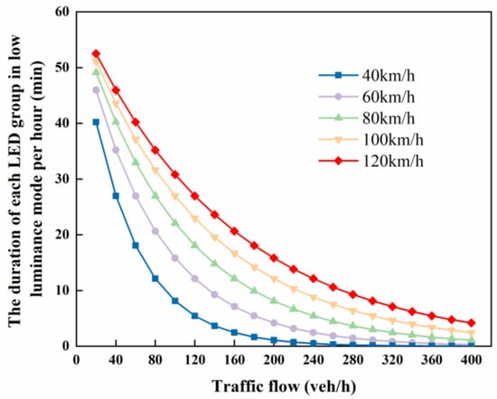 According to the calculation model, the duration of each LED group in low illumination mode per hour under different velocities of the vehicle and traffic flow are evaluated. As shown in Figure 13, the duration of low illumination mode for the LED groups decreases with the traffic flow. When v = 40 km/h, the duration of low illumination mode for each LED group per hour for q = 20 veh/h is 40.22 min; however, the duration of low illumination mode for each LED group per hour for q = 400 veh/h is only 0.02 min. In addition, the velocity of the vehicle also significantly affects the energy-saving effect of the intelligent control system of tunnel lighting. Under the same traffic flow, the duration of low illumination mode for each LED group increases with the velocity of the vehicle. When q = 20 veh/h, the duration of low illumination mode for each LED group for v = 120 km/h is 52.5 min, which is 30.53% higher than that for v = 40 km/h. Compared with the general lighting control system, the energy-saving effect is as high as 87.5% when q = 20 veh/h and v = 120 km/h.
