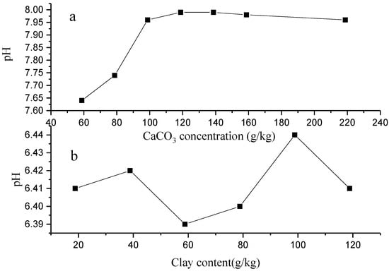 The contents of Cu, Zn, Cd, Cr, Pb, Hg and As in the soil material were 10.8 mg/kg, 125 mg/kg, 0.489 mg/kg, 23.5 mg/kg, 22.7 mg/kg, 58.3 mg/kg and 45.4 mg/kg, respectively. According to the “soil environmental quality: risk control standard for soil contamination of agricultural land” (GB 15618-2018) released by Ministry of Ecology and Environment of the People’s Republic of China, Cd and As exceed their control values which are 0.3 mg/kg and 30 mg/kg, respectively. As shown in Figure 2a, the soil pH values increased with CaCO3 concentration in the soil, and the fluctuation of the soil pH values was weak after the CaCO3 concentrations reached 100 g/kg. In soil, the effect of CaCO3 on pH was due to the hydrolysis of carbonate (MCO3 + H2O ⇋ M2+ + + OH−) [36]. Liu et al. [37] reported that CaCO3 concentrations slightly affected the soil pH when the content of calcium carbonate was 50–100 g/kg, which is consistent with our study. The different clay contents caused a difference in soil pH values, and the maximum and minimum pH values of the soil were 6.44 and 6.39, respectively.