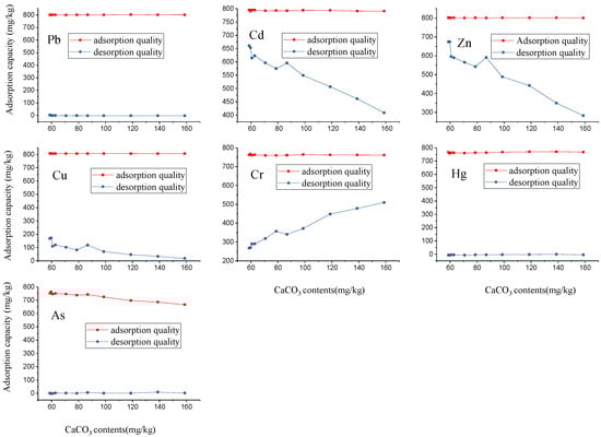 The adsorption capacity of Cu, Zn, Cd and Pb did not obviously change with the increase in CaCO3 content in soil. However, the adsorption capacities of Hg and Cr slightly increased with increasing CaCO3 content in the soil sample. A negative correlation between the adsorption capacities of As and the CaCO3 content was observed because the adsorption capacity of As decreased significantly as the CaCO3 content of the soil material increased. Zhong et al. [38] reported effects of CaCO3 addition on uptake of heavy metals and arsenic in paddy fields, and the exchangeable arsenic content in the soils decreased significantly by adding CaCO3. The reason may be that Ca in soil can form insoluble precipitation with As, which was conducive to the fixation of As. The desorption capacities of Cu, Cd and Zn were decreased with increasing CaCO3 content in the soil sample. However, with the increase in CaCO3 content in the soil material, the desorption capacities of As and Pb did not significantly change. The desorption capacities of Cr were increased with increasing CaCO3 content in soil sample. Therefore, with the increase in the CaCO3 content in the soil sample, the adsorption and fixation of Cu, Cd and Zn were enhanced, and the adsorption and fixation of Cr and As were weakened, but Pb had no obvious effect. With the increase in CaCO3 content, the adsorption capacity of soil material was increased by approximately 10 mg/kg on average, and the desorption capacity decreased by approximately 300 mg/kg on average. The pH value of soil increased after adding calcium carbonate, which promoted the precipitation reaction of exchangeable Cd2+, Cu2+, Pb2+ and Zn2+ with carbonate and hydroxide in soil. Meanwhile, the coprecipitation of Ca2+ and metal ions is also conducive to the transformation of the exchange state to other forms. Additionally, the increase of soil pH can enhance the chelating capacity of clay and organic matter, promote the adsorption capacity of soil, and reduce the desorption of heavy metals, thus decreasing the solubility of heavy metals in soil [39]. In contrast, the adsorption capacity of the soil materials was continuously increased with the decrease in CaCO3 content. This may be because with the decrease of pH value, the negative charges on the surface of clay minerals, hydrated oxides and organic matter in the soil decreased, and the adsorption capacity of heavy metals weakened. Meanwhile, the specific adsorption of heavy metals on the surface of oxides and the stability of soil organic matter metal complexes decreased with the decrease of pH value. With the decrease of pH, the concentrations of H+ and Fe2+ in soil increase, and the competitive adsorption with heavy metals increases, which is not conducive to the adsorption of heavy metals. The decrease of pH is not conducive to the formation of metal hydrate ions, and the affinity of hydrated ions on soil adsorption sites is significantly lower than that of heavy metal ions, which is not conducive to the adsorption of heavy metals on soil [40]. However, the effects on different elements are different, such as inhibiting the transport of nitrate nitrogen from the underground of wheat to the aboveground, promoting the uptake of chromium in the aerial parts of Chinese cabbage, and enhancing the enrichment of lead in lettuce stems and leaves.